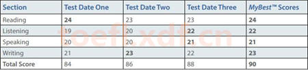 假如有一位考生两年内共进行了3场托福考试,具体成绩如下表,最后一栏展示的即为托福拼分,考生的最佳成绩。图中标粗的分数被算入拼分中。