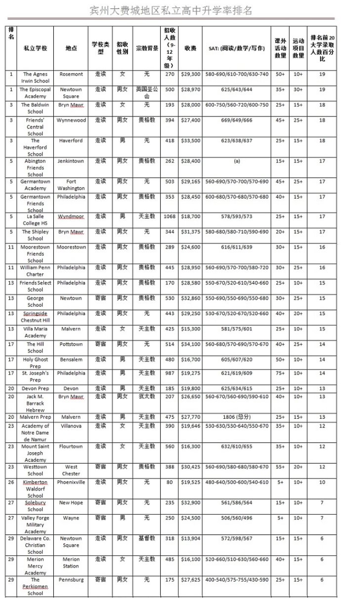 根据宾州费城非常有影响力的官网www.phillymag.com统计公布,以下学校是在费城大地区(费城市以及周边的小城市)的部份私立高中,以升入排名前20名大学的录取率人数的百分比来排名。从以下数据,大家可以看到大名顶顶的寄宿高中The Hill School(希尔高中) , Westtown School (西城高中)和 George School (乔治学校)的升学数据。